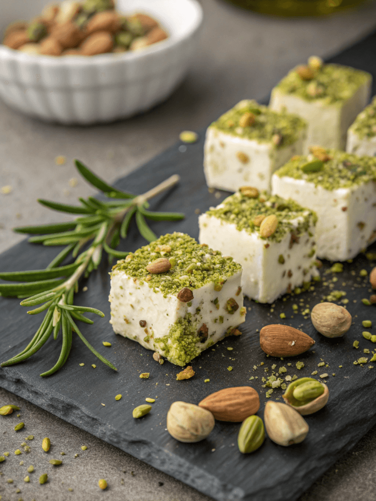 In a small bowl, combine the chopped pistachios and finely chopped rosemary. This fragrant mixture will provide a delightful crunch and aroma to our bites.