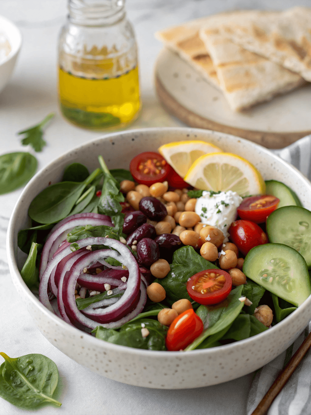 Now comes the fun part! In each serving bowl, start with a base of baby spinach. Layer on the cooled quinoa, followed by chickpeas, tomatoes, cucumber, red onion, olives, and feta cheese. Arrange the ingredients in sections for a visually appealing presentation.