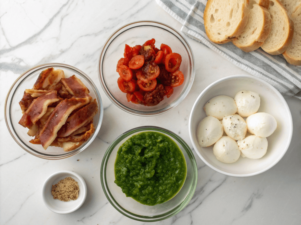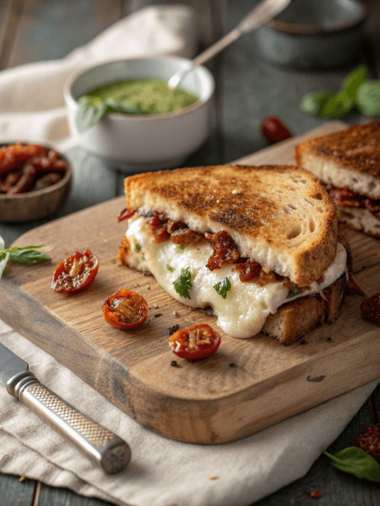 On top of the pesto, carefully arrange slices of fresh mozzarella. The creamy, mild cheese will melt beautifully, creating that perfect cheese pull we all love. Next, sprinkle the chopped sun-dried tomatoes over the mozzarella. These little flavor bombs will add a delightful tangy sweetness to your sandwich. If you’re using bacon, now’s the time to add it. The salty crunch of bacon complements the other ingredients perfectly.